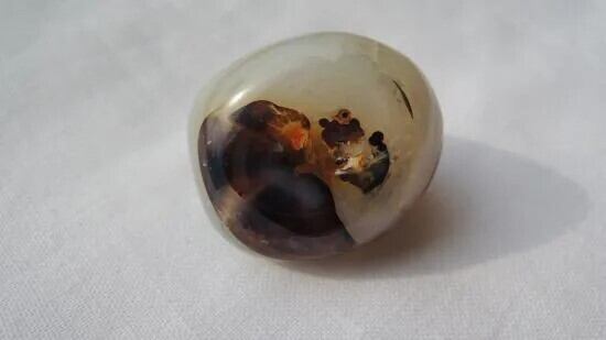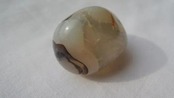 こちらは明るい朱色のような点をもった半透明のアゲートのタンブルです 見事なフラクタルはありませんがアゲートらしいサークルとストライプのパターンが現代アートのようです
