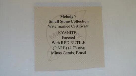 証明書に記載された名前の最後に(レア)とあるように、赤いルチルを内包した珍しいカヤナイトです