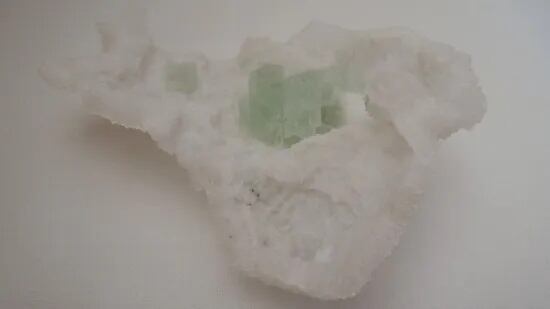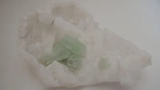 真っ白なミルキークォーツの空洞に、美しいグリーン・フローライトの結晶がひっそりと宿っています