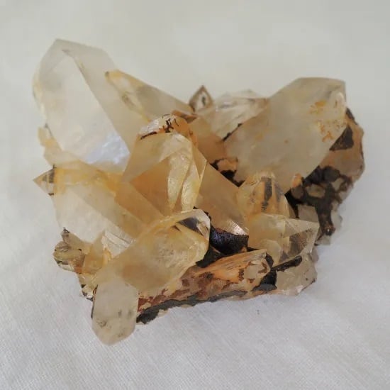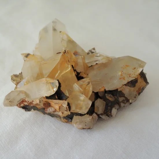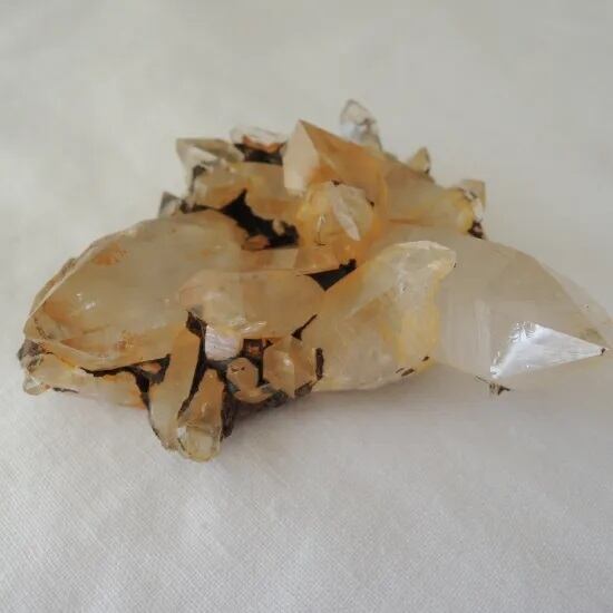 鉄分でオレンジがかったクォーツで平たいクラスターが形成され、そこにゲーサイトがついていま、