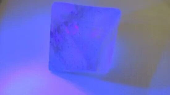 写真の最後の一枚はブラックライトを当てたところで、直方体をした内包物がピンクに光っています
