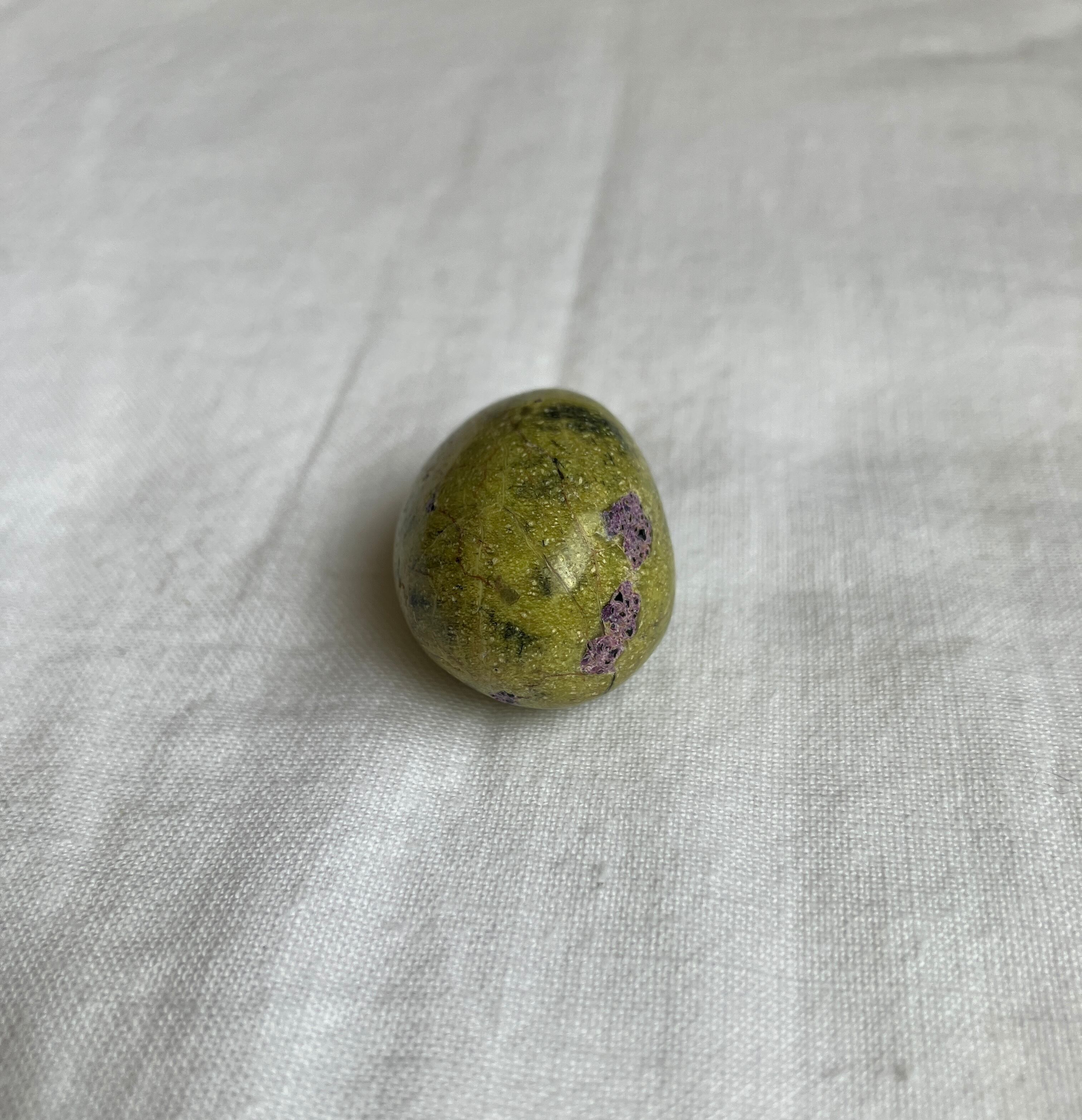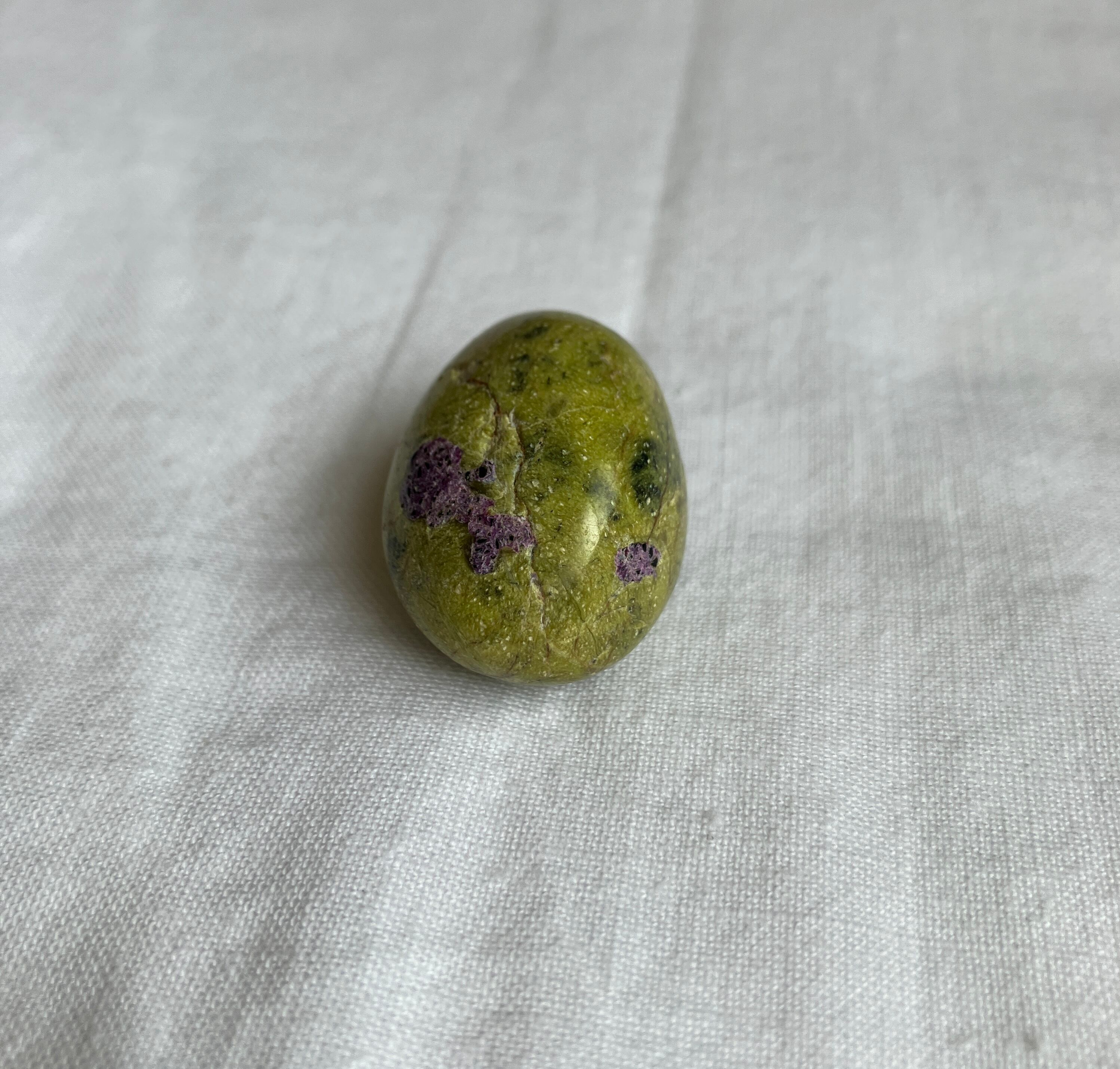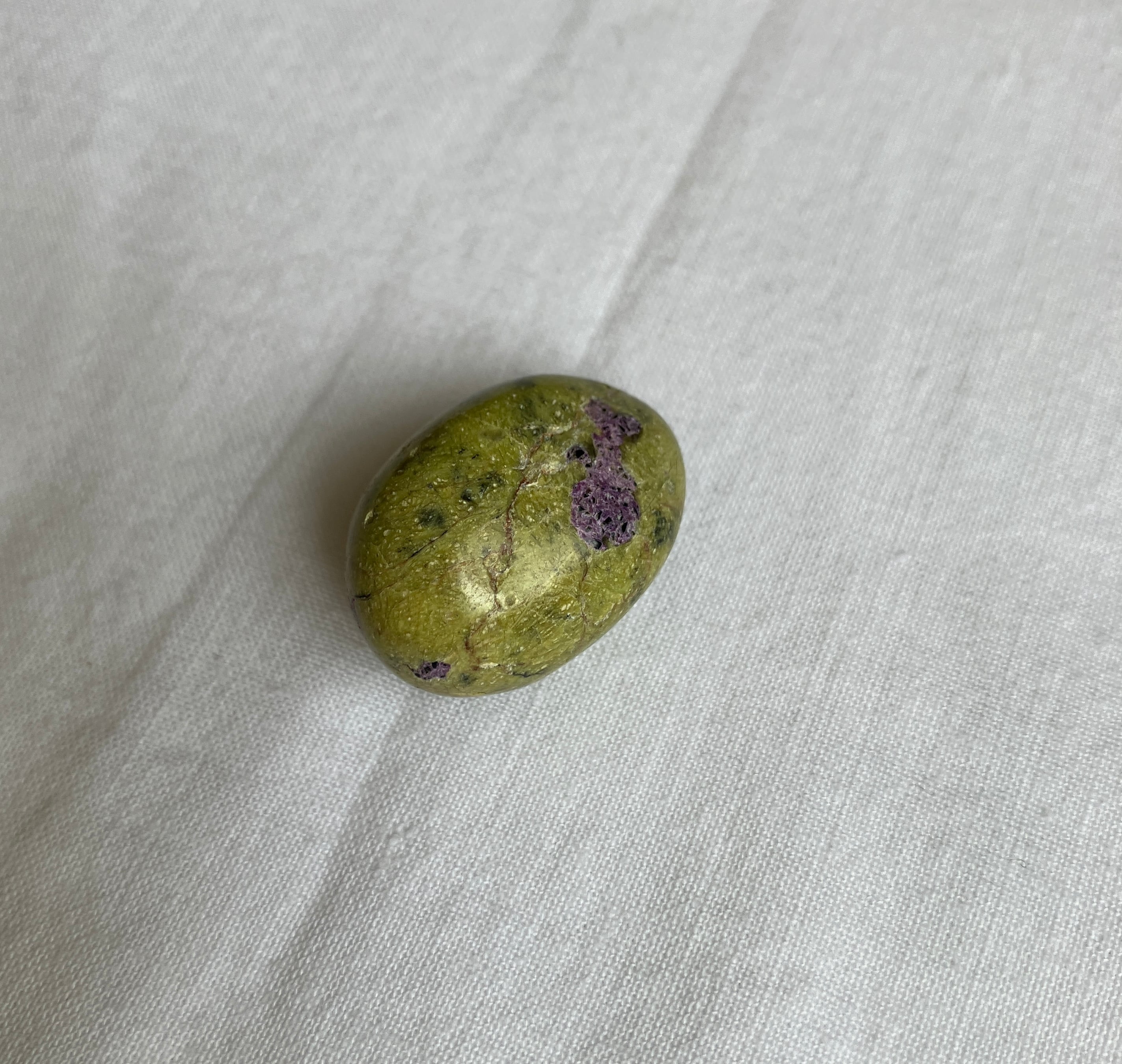 タスマニア島のスティヒタイト丘)で産出され、グリーンのサーペンティンと紫色のスティチタイトが混ざった石です